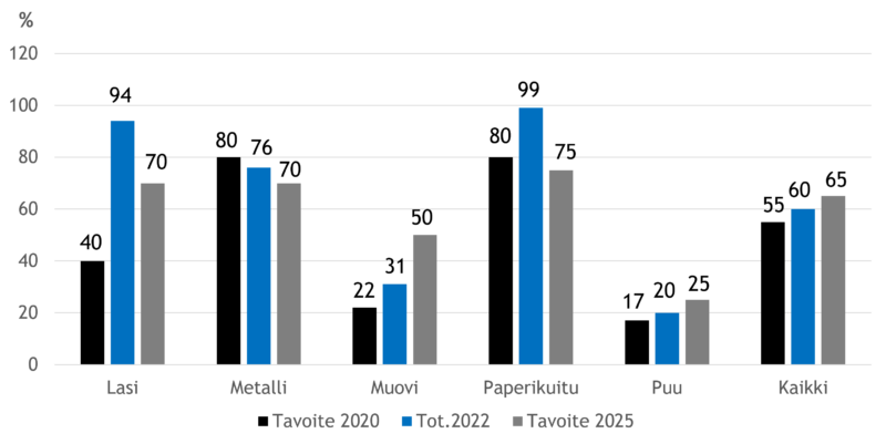 Kaikkien pakkausten yhteinen kierrätysaste vuonna 2022 oli 60 %, kun tavoite oli silloin vielä 55 %. Vuodesta 2025 alkaen tavoitteet nousevat porrastetusti, ensin 65 %:iin ja 2030 vuonna 70 %:iin. Erityisesti muovi- ja puupakkausten keräys- ja kierrätysasteita on saatava vahvaan nousuun.